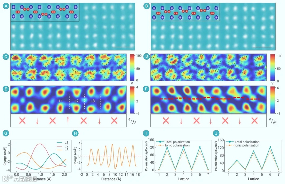 图4 相界面处的电荷密度与极化特性。(A)和(B)分别展示了铁电-反铁电混合相T-O相界面的原子级分辨率HAADF图像。(C)-(F) 分别为图(A)和(B)中红框区域的电场图和电荷密度图。(G) 展示了图(E)中从左至右的三条白虚线(L1至L3)的电荷密度变化。(H) 展示了图(F)中从左至右沿红色虚线的电荷密度变化。(I)和(J)分别展示了在铁电-反铁电混合相和T-O相界面处ZrO2的总极化和离子极化。