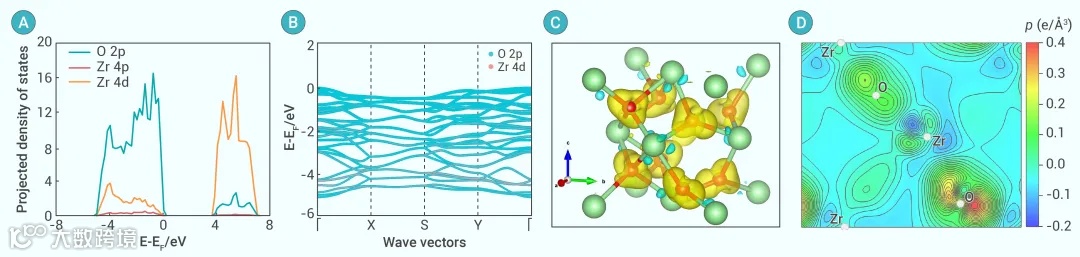 图5 DFT计算结果分析。(A) ZrO2的投影态密度(PDOS)图。(B) 投影能带结构图。(C) 变形电荷密度的等值面图,显示了Zr原子和O原子之间的电荷密度变形。(D) 电荷密度沿[100]晶带轴方向的2D投影图。
