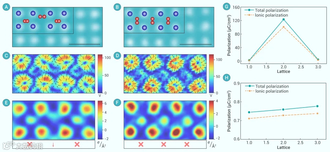 图3 正交相和四方相的电荷密度与极化分析。(A) 从[100]晶带轴方向获取的铁电O相的原子级分辨率HAADF图像。(B) 非极性T相的原子级分辨率HAADF图像 (C)和(D)分别是从图(A)和(B)中红框区域收集的4D-STEM数据计算出的电场分布图。(E)和(F)分别是从图(A)和(B)中红框区域收集的4D-STEM数据计算出的电荷密度图。(G)和(H)分别展示了从实验数据计算得到的极性O相和非极性T相ZrO2的总极化和离子极化值。