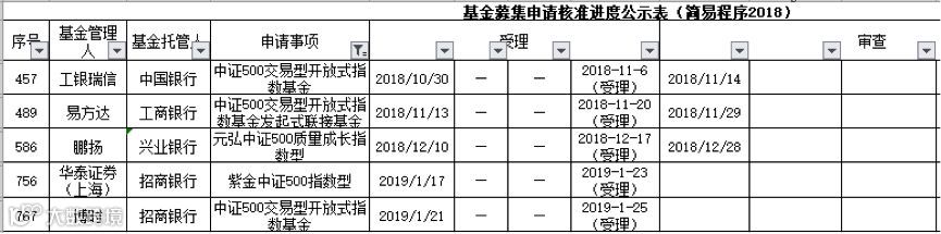 证监会官网《2019基金募集申请公示表(截止2019年1月25日)》显示,目前共有5只与中证500指数相关联的基金产品正等待审批。最新一只是来自博时基金的中证500ETF产品,申请材料接受日为2019年1月21日。
