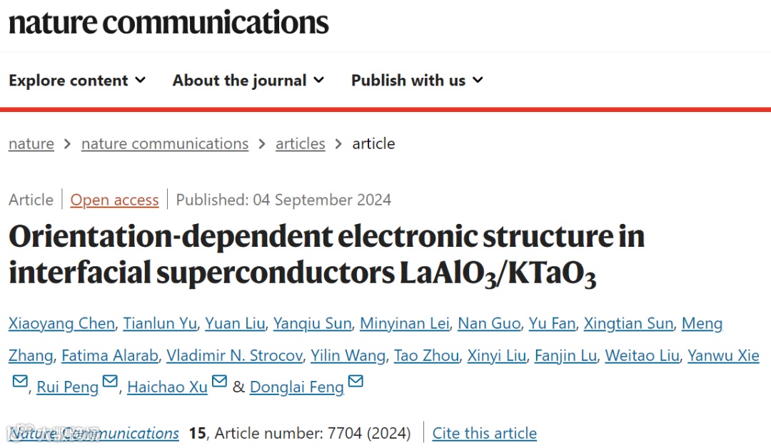 2024年9月4日,Nat. Commun.在线发表了复旦大学徐海超副研究员、彭瑞研究员、中国科学技术大学封东来教授和浙江大学谢燕武教授课题组的研究论文,题目为《Orientation-dependent electronic structure in interfacial superconductors LaAlO3/KTaO3》,论文的第一作者为Xiaoyang Chen。