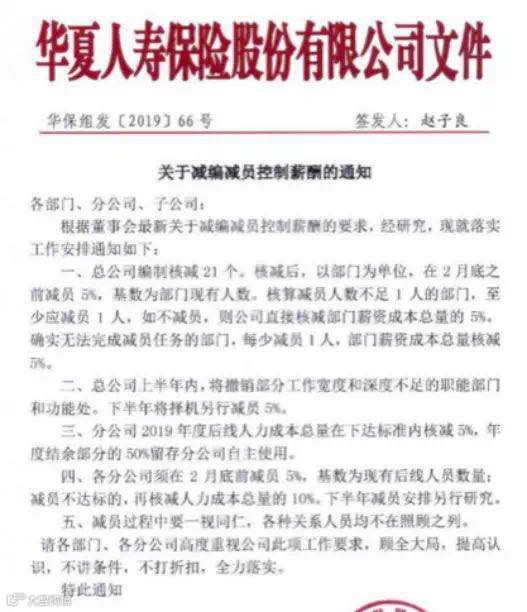 保险机构同样面临降薪。日前,华夏保险印发了《关于减编减员控制薪酬的通知》,将减员5%或减少薪资成本5%。