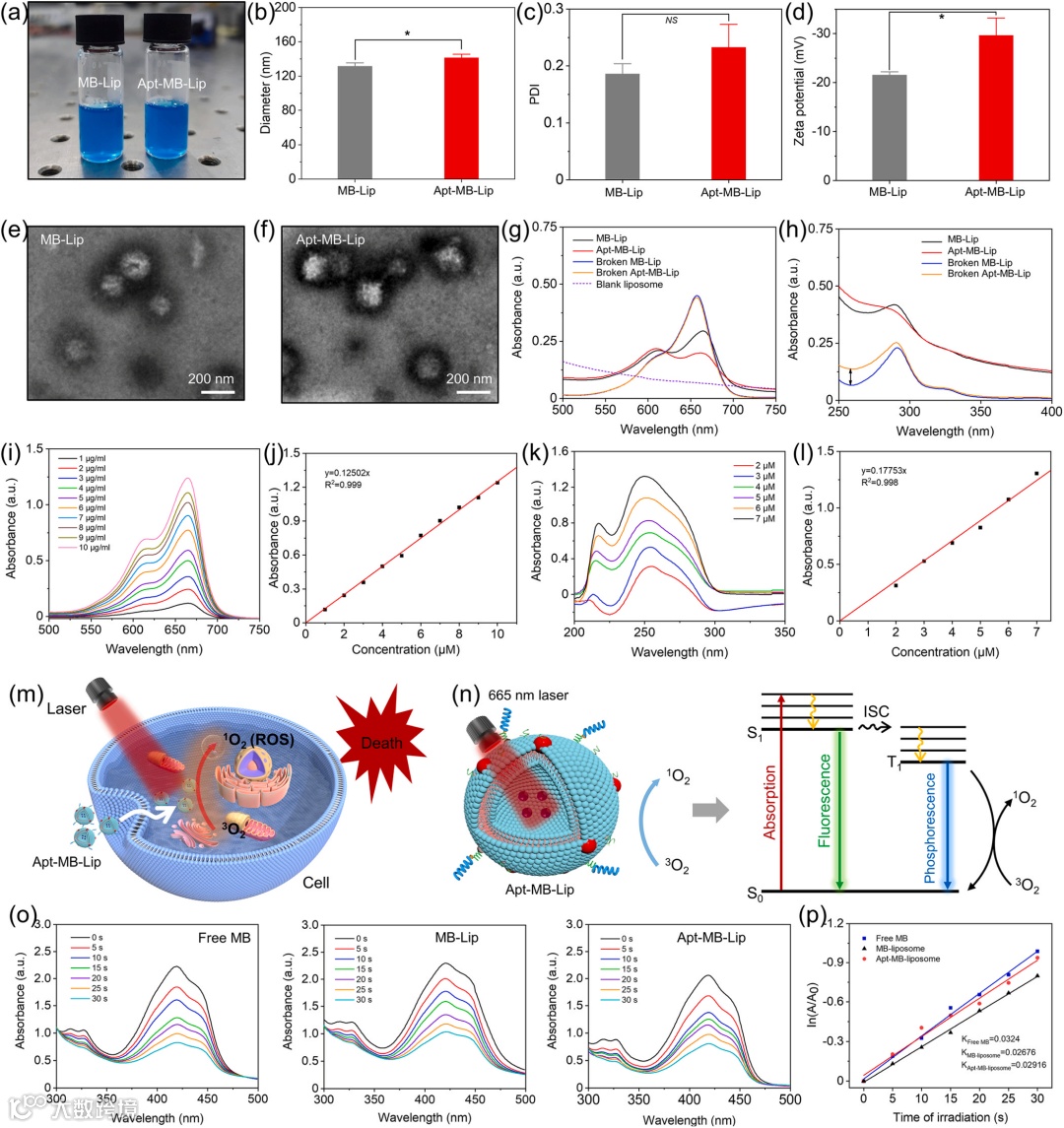 作者进一步对比了适配体修饰前后脂质体的物理化学性质,包括粒径、PDI和zeta电位等(图3)。TEM图像显示了脂质体的形态,而UV-Vis光谱分析证实了亚甲蓝在脂质体中的包封效率以及适配体的修饰成功。研究还通过DPBF实验检测了MB-Lip和Apt-MB-Lip在光照条件下的单线态氧生成效率,结果显示Apt-MB-Lip具有更高的单线态氧产率,这表明其在光动力疗法(PDT)中的潜力更大。