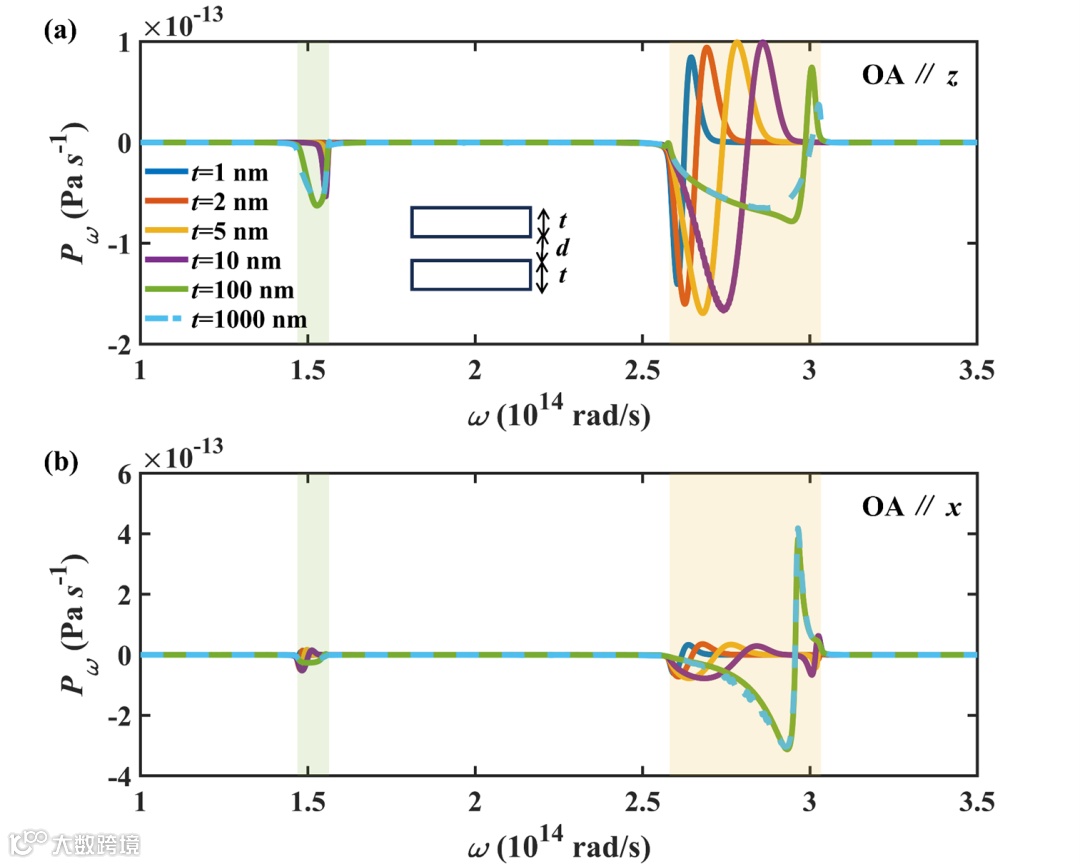 图4 当光轴沿x轴(a)和z轴(b)时,有限厚度hBN平板之间的卡西米尔谱力。