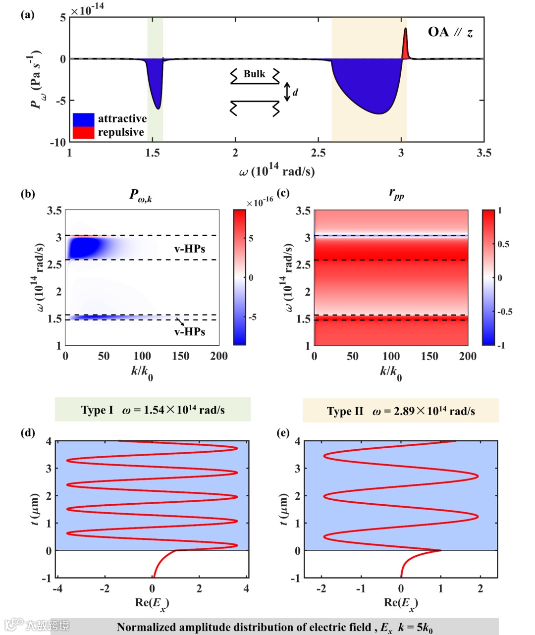 随着材料科学的发展,近年来人们对卡西米尔力的研究得到了复兴。双曲材料是一种新型材料,其介电常数张量的主对角线元素在双曲波段内具有相反符号,引起了人们的广泛关注。然而,双曲材料卡西米尔相互作用背后的物理机制很少被讨论。Henkel等人开创性的工作说明了表面等离激元对金属平板间卡西米尔力的影响。与之对应,双曲材料可以在大波矢下激发体态双曲激元,表面双曲激元,在近场研究中是不可忽视的。然而,双曲激元对卡西米尔力的驱动作用尚未得到研究。