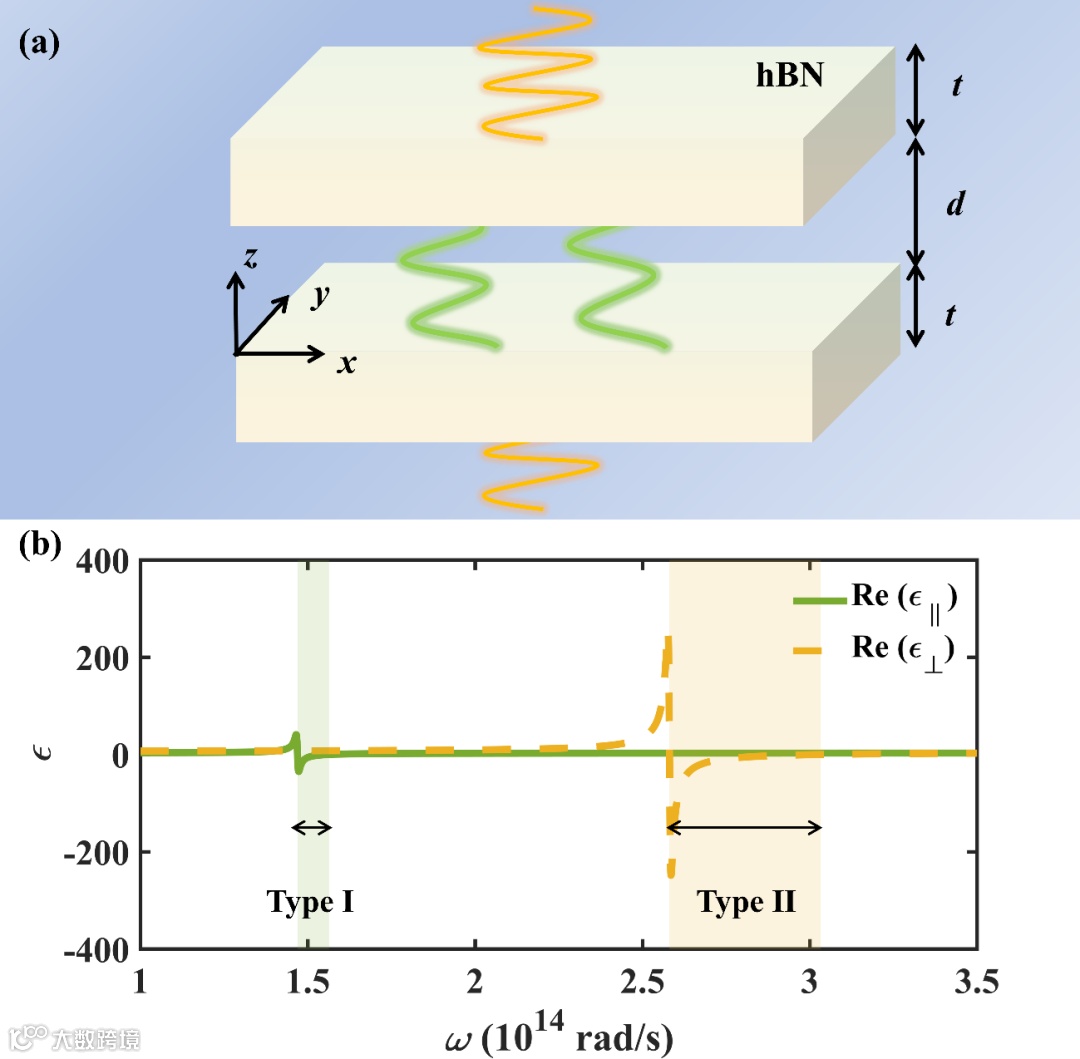 图1 (a)hBN平板之间的卡西米尔力,(b)hBN介电常数。