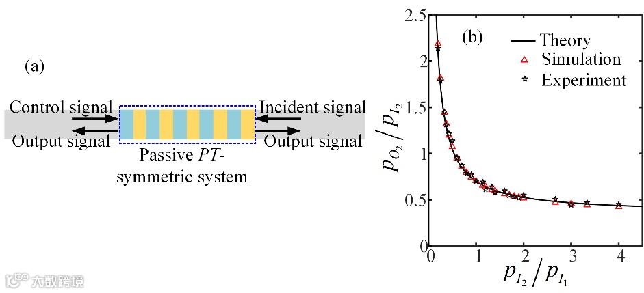 宇称时间((Parity-Time,PT))对称性最初是量子力学中的一个概念,1998年由Bender和Boettcher教授研究构造了一种异于经典量子系统的PT对称量子系统,该研究表明非厄米—算符本征值在宇称时间对称性亦可为实数。近年来,PT对称性被推广到经典波系统,在光学和声学等领域也存在PT对称性。PT对称系统一般存在两类简并点。一类是在对称破缺临界点处的特殊点(Exceptional point,EP),在该特殊点存在对称性自发破缺提供单向反射特性。在该特殊点附近,可以呈现单向隐身、单向无反射、相干完美吸声和单模激光等奇特的物理现象。另一类简并点发生在对称性破缺相内的相干完美吸收-激光点(coherent perfect absorber-laser point,CPA-laser),其散射矩阵的本征值的极值点和零点在该点处共存。在CPA-laser点附近,系统会呈现出完美吸声和激射共存现象,这一特性为实现高对比度的光波调制提供了新的途径。如果将光学中对称破缺相内的CPA-laser点引入到声学PT对称系统中,则有望实现具有放大、吸收以及调制等的多功能声学器件。