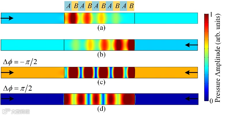 图2 CPA-emitter点处的数值模拟声压场分布图。其中黑色箭头代表的是入射声波的方向。(a)和(b)分别表示声波从左侧和右侧单独入射。(c)和(d)分别代表声波从左右两端同时入射,相位差分别为