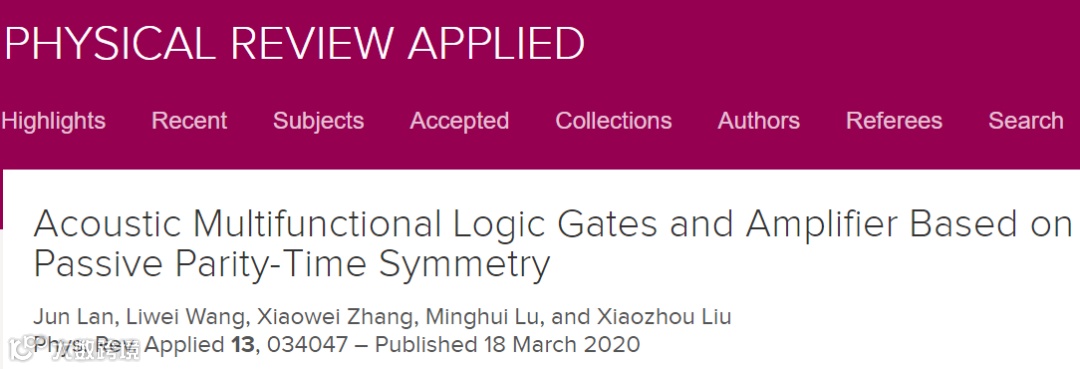 声学功能器件一直是声学计算和通信的核心元件。近日,来自南京大学的刘晓宙课题组和卢明辉课题组合作提出一种无源声学PT对称超构材料中相干完美吸收-激发点(Coherent perfect absorber-emitter point, CPA-emitter )的概念,即光学PT对称系统中的CPA-laser点在无源PT对称声学系统中的等价点。采用周期性分布泄漏结构的矩形波导,实现了无源PT对称势的调控。通过精巧地设计无源超构材料的无损和损耗区域,在CPA-emitter点处达到高效率的相干控制,从而使吸收和发射状态之间具有较大的对比度。利用该无源PT对称超构材料在理论和实验上实现逻辑门和小信号放大器集成的声学器件。相关研究以“Acoustic Multifunctional Logic Gates and Amplifier Based on Passive Parity-Time Symmetry”为题发表在PHYSICAL REVIEW APPLIED [PHYSICAL REVIEW APPLIED 13, 034047 (2020)]。