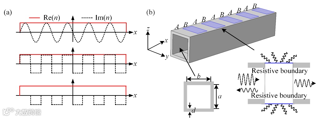 图1无源PT对称超构材料的设计。(a)折射率n的实部(红色实线)和虚部(黑色虚线)沿着x轴方向的分布,从有源宇称时间对称系统到无源宇称时间对称系统演变过程。(b)无源PT超构材料的空间结构示意图。