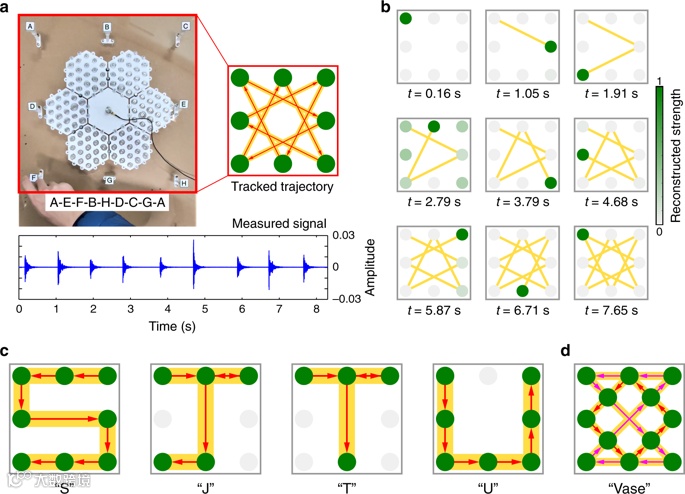 论文提出的超材料结构系统呈现出一种新型轻量化振动溯源器件原型(图5)。该超材料系统具有一种时空耦合编码能力,研究人员成功展示了对一系列振动激励事件进行轨迹追踪的实验结果,从而创建了一种基于单传感器振动溯源的可用于指令、通信、加密和触摸传感的新型人机交互方式。这一创新工作开辟了利用超材料结构进行空间振动传输编码的新途径,提出的超材料模型有望与智能设备、平台和结构(如可穿戴设备、机器人、四旋翼无人机和飞机机翼等)集成,从而可应用于人机交互、医疗保健监测、工业振动检测、机器人传感、信息处理与通讯等领域。
