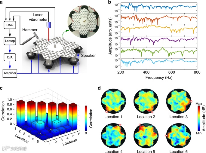 图3. 超材料系统空间振动传输编码实验验证。(a)实验装置示意图。(b)超材料系统在不同位置激励下的振动传递特性。(c)传递特性相关系数矩阵。(d)超材料系统在不同位置激励下的振动模态,反映了振动在随机化超材料结构中传播的复杂性。