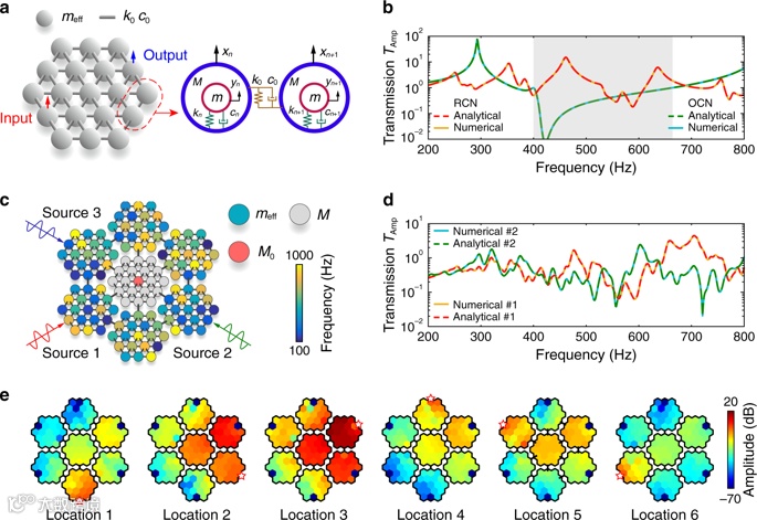 在自然界,蜘蛛可以灵敏感知和定位落在蛛网上昆虫的振动。像蜘蛛一样利用传感器对远处的振动激励进行感知和定位即为振动溯源,在医疗健康监测、机器故障诊断、智能设备和物联网等领域具有重要的应用价值。传统的振源辨识技术通常依赖于多个分布式传感器或传感器网络,测试系统复杂且功耗较高。为了突破传统振源辨识技术受传感器数量限制的瓶颈难题,上海交通大学何清波教授等人利用超材料结构的原理,提出了振动传递特性设计和调控的思想。超材料是一种自然界不存在的人工复合材料,具有超常的动力学特性。一般超材料具有周期性复合结构,但是周期性超材料结构难以对来自多个方位的振动传递特性进行灵活调控。