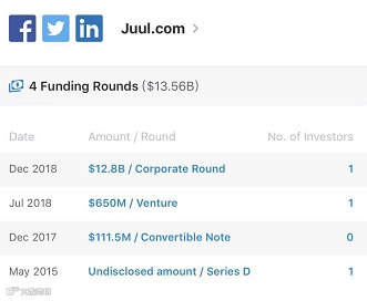 企业服务数据库公司Crunchbase数据显示,Juul共获得4轮融资,总融资额达135.6亿美元。今年7月份Juul公司的估值是150亿美元,而到12月份,其拿到万宝路香烟生产商奥驰亚集团128亿美元收购35%股权的投资协议后,估值直接翻倍到380亿美元。超过刚刚融资5000万美元的钢铁侠马斯克旗下的商业太空公司SpaceX(估值305亿美元),更是计划明年IPO的图片社交分享网站Pinterest估值的三倍有余(120亿美元)。