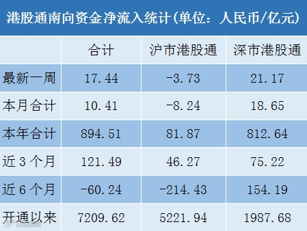 而从近一周来看,虽然沪市港股通上周仍录得小幅净流出3.73亿元,但较此前一周流出幅度有所缩小;深市港股通上周录得净流入21.17亿元,且已经连续8个交易日录得资金净流入,较此前一周出现明显扩大。