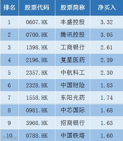 据万得数据显示,最近7天港股通南向资金净买入前十的个股分别为丰盛控股、腾讯控股、工商银行、复星医药、中航科工、中国财险、东阳光药、中芯国际、招商银行和中国铁塔。