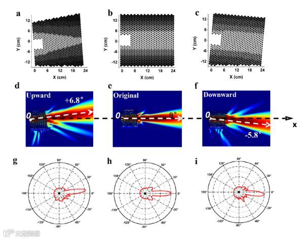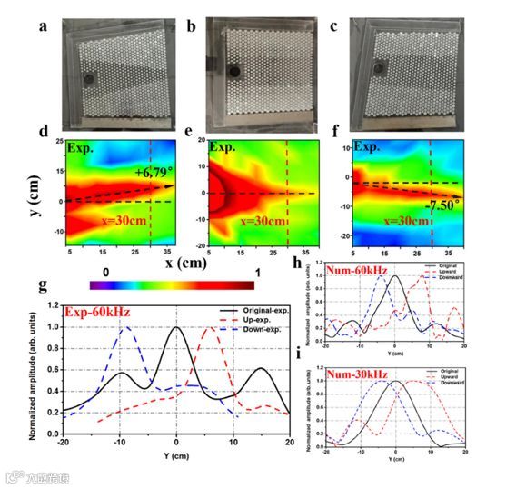 利用等效介质理论实现了仿生器件的声速分布,如图2(a-c)所示。仿真计算了该器件对声波束的调控作用,如图2(d-f)。图2(g-i)说明了波束有很好的指向性。接下来,研究人员开展水下声学实验,验证了该器件的波束控制性能。