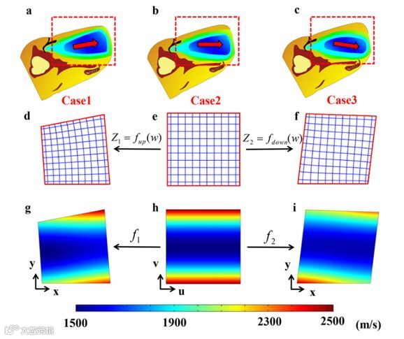 如图1所示,(a-c)中变换1表示抹香鲸头部向上变形,变换2表示头部处于原始的状态,变换3表示头部向下变形。图1(d-f)表示与之对应的保角变换坐标分布,(g-i)表示利用保角变换确定的声速分布。基于此仿生设计原理, 研究人员通过数值仿真和水下实验验证了所设计的仿生结构对声波束的调控作用。