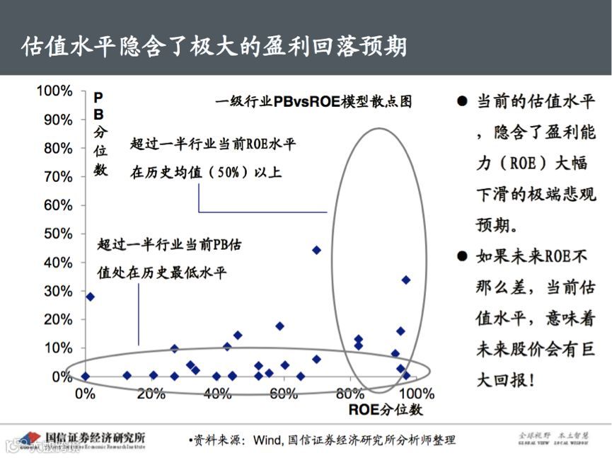 “当前的估值水平,隐含了盈利能力(ROE)大幅下滑的极端悲观预期。”燕翔指出,无论历史还是国际比较,当前A股的估值水平都处在底部位置。但在超过一半行业当前PB估值处在历史最低水平的同时,超过一半行业当前ROE水平在历史均值(50%)以上,这意味着,如果未来ROE不那么差,当前未来股价会有巨大回报。
