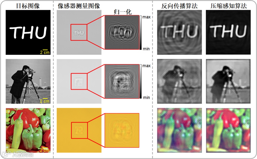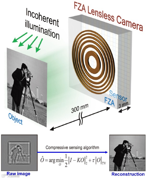 其成像装置仅由一个图像传感器和放置在传感器前几毫米处的菲涅尔波带片构成,且无需任何校准方案。通过使用全息重建中压缩感知去孪生像的方法使得成像质量大幅提高。