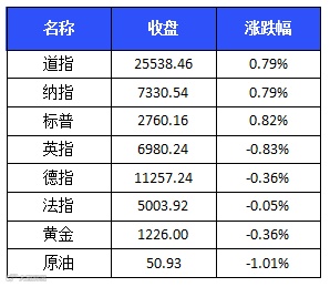 美三大股指上周五上涨,标普500指数上涨0.82%报2760.16点,道琼斯工业平均指数上涨0.79%报25538.46点,纳斯达克综合指数上涨0.79%报7330.54点。上周,标普500指数涨4.8%,道指累涨5.1%,纳指累涨5.6%。11月,标普500指数上涨1.8%,道指上涨1.7%,纳指上涨0.3%。