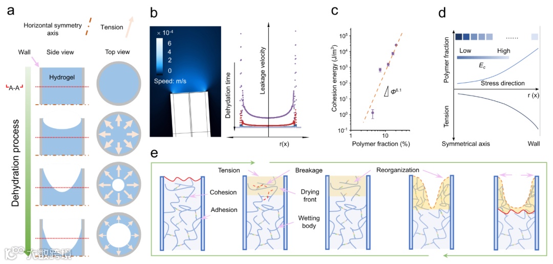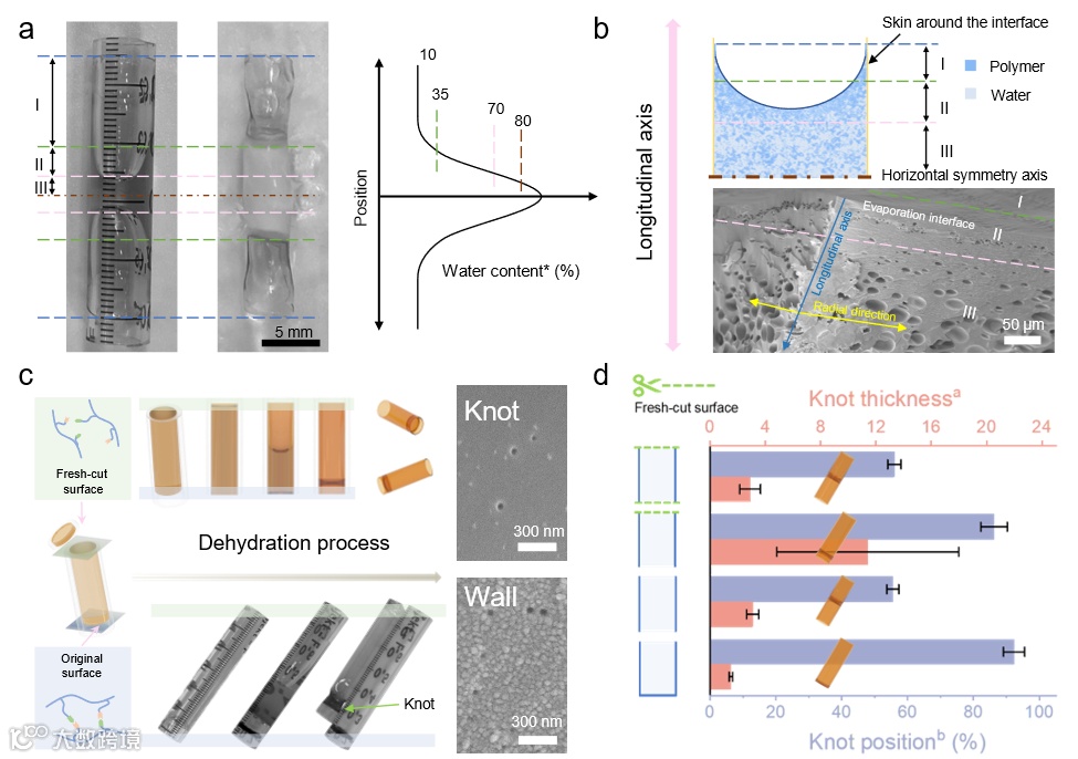 近期,哥廷根大学木材技术与木基复合材料张凯教授团队报道了一种关于动态水凝胶的全新脱水模式。通过将水凝胶置于一定直径的管内并自然干燥,动态水凝胶表现出完全不同于共价交联水凝家胶的、各项异性的脱水过程,并生成了具有连续曲面-节结构的中空结构体(图2a);进一步的结构表征证明,该干凝胶内部排列没有有序结构的形成(图2e)。这表明,此干燥过程不同于传统的液体辅助的干燥模式,如Langmuir-Blodgett沉积法或者恒定接触直径模式。通过对脱水过程的理论模拟,确认了沿管径方向干燥速率存在梯度分布的差异(图3a, b);基于标度关系,建立了水含量与内聚能密度的关系,进一步确认了脱水过程中内应力的方向与分布(图3c, d);结合水凝胶中动态网络的特点,提出了脱水过程中内应力释放导致的水凝胶-空气界面的破坏与再生过程。