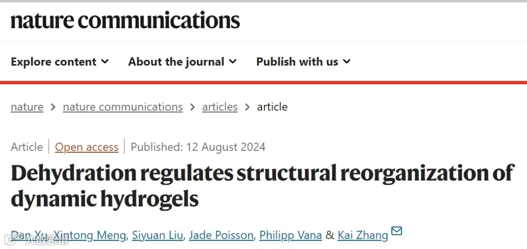 脱水过程在自然界中广泛存在。水凝胶作为一种高含水率的功能材料,在实际应用中也面临着脱水的问题。以自由水、中间态水和结合水等形态存在于水凝胶中的水分,在脱水过程中会经历动态的转化,并深刻影响水凝胶的结构。长期以来,基于共价交联水凝胶中各向同性脱水模式的观察,限制了人们对动态系统在脱水过程中结构演变的认知。
