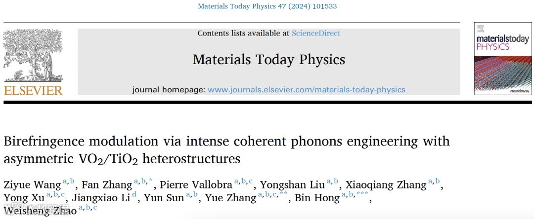 近期,杭州北航国际创新研究院自旋芯片与技术全国重点实验室赵巍胜教授、北航集成电路科学与工程学院张悦教授研究团队采用超快时间分辨泵浦-探测技术,在非对称(011)-VO2/TiO2体系中实现了强相干纵向及剪切声学声子的激发,并基于该超快相干声子实现了对亚太赫兹频率下的正负双折射调制。相关成果以“Birefringence modulation via intense coherent phonons engineering with asymmetric VO2/TiO2 heterostructures”为题发表在国际一流期刊《Materials Today Physics》上。北京航空航天大学集成电路科学与工程学院在读博士研究生王子岳为论文第一作者,张悦教授、张帆副研究员、洪宾副研究员等为共同通讯作者。