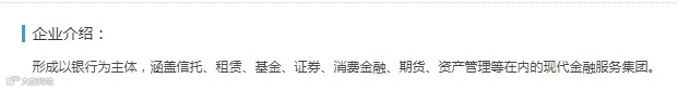 招聘信息页面中,还有关于该银行的“企业介绍”,内容为“形成以银行为主体,涵盖信托、租赁、基金、证券、消费金融、期货、资产管理等在内的现代金融服务集团”。而这,与兴业银行百度百科的介绍正好相符。