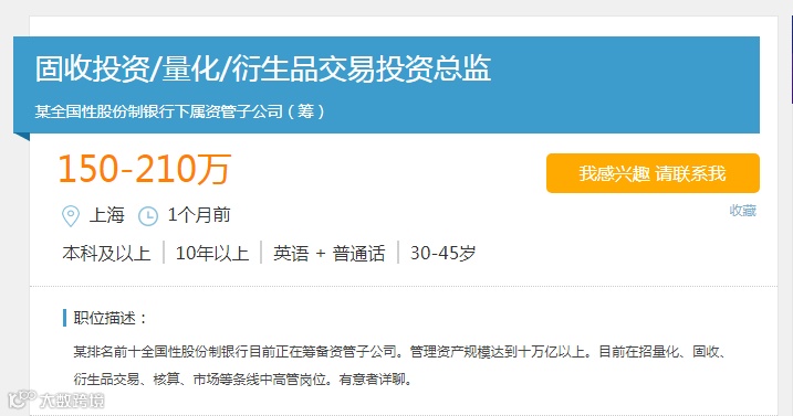 中国证券报(ID:xhszzb)记者在猎聘网看到,某排名前十的全国性股份制银行正在招聘固收投资/量化/衍生品交易投资总监,年薪为150万元~210万元。