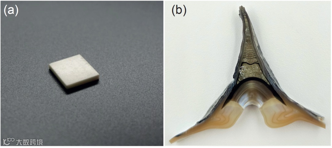 (a) 俞书宏团队合成的人工珍珠母材料;(b) 天然贝壳中,连接贝壳两壳的铰链部位。