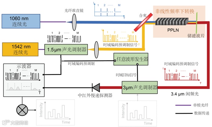 本文提出了基于非线性频率下转换的中红外时域计算鬼成像概念,利用近红外波段成熟的光纤激光器及其时域调制技术,结合非线性频率下转换过程,采用慢速光电探测器成功实现了对中红外高速时域光信号的探测。具体的,如图1所示,研究人员利用通信波段光调制器对1542 nm的信号光进行时域编码预调制,将预调制后的1542 nm光与1060 nm连续波光纤激光器在非线性晶体PPLN中差频,从而产生中红外波段闲频光,并成功将1542 nm信号光时域编码预调制信息转移至3.4 μm闲频光处(图2)。携带时域强度预调制信息的中红外光经过时域目标信号强度调制后用中红外低速探测器采集其积分功率,将多组编码预调制信号与对应的积分功率进行关联运算,可恢复出时域目标信号对中红外光的强度调制信息,实现中红外时域计算鬼成像。
