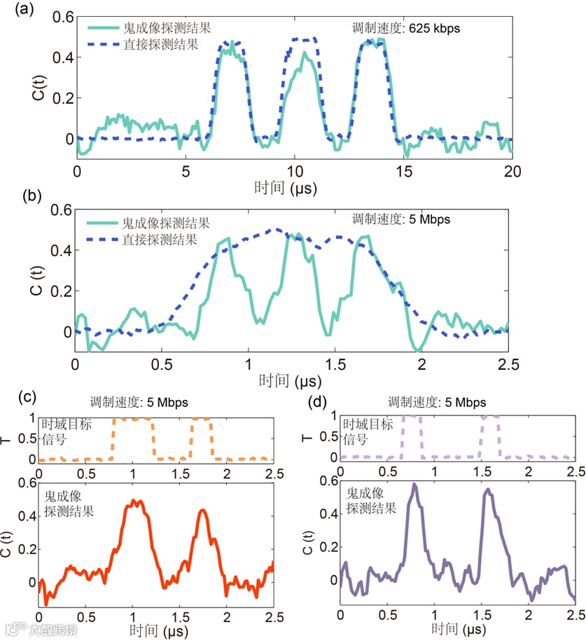 为了对中红外时域计算鬼成像进行概念演示,研究人员通过在中红外声光调制器上加载设定的0-1比特序列,对中红外闲频光的强度进行调制,作为待测中红外时域目标信号。利用1 MHz 带宽的中红外慢速光电探测器采集经强度调制后的中红外光信号,将探测的积分功率信息与对应的时域编码预调制型号进行关联运算即可恢复中红外声光调制器对中红外的时域强度调制信息。图3展示了中红外声光调制器的调制速度分别为625 kbps和5 Mbps下鬼成像探测结果和采用1 MHz 带宽的中红外慢速光电探测器直接探测结果,可以看出,中红外时域鬼成像技术可以很好的恢复出时域目标信号,并在探测器带宽远小于调制速率时依然能实现对中红外光调制信号优异的解调性能。此外,研究人员也展示了采用正交编码的时域编码预调制信号光,可进一步降低时域计算鬼成像采样次数。进一步的,研究人员通过调谐差频中连续波光纤随机激光器波长,验证了该方案的波长可拓展性,实现了在3.2-4.3 μm波段对调制速度为5Mbps的时域目标信号的时域鬼成像探测。后续可进一步采用通信波段高速电光调制器对近红外光进行编码预调制,实现超高时间分辨率的中红外时域鬼成像。