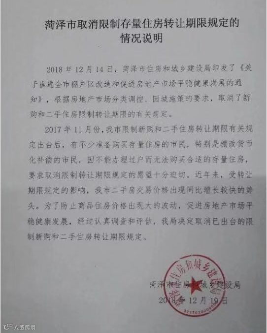 菏泽出台取消限售措施发酵一天后,在12月19日晚间迎来最新进展。