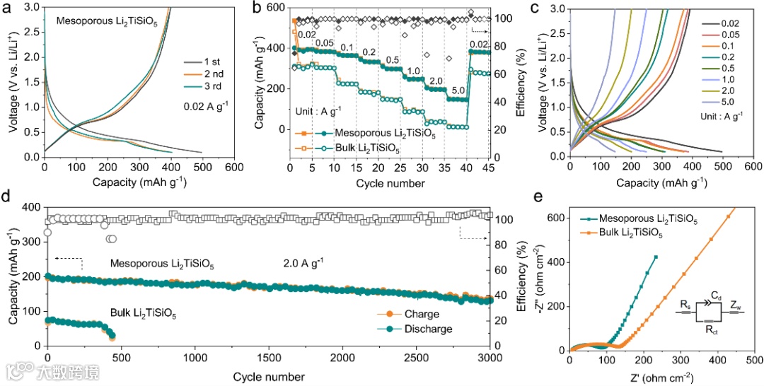 电化学测试表明,得益于介孔结构和纳米级晶体骨架所实现的快速离子扩散,该类单晶介孔Li2TiSiO5负极具有约0.28 V(V vs. Li/Li+)的安全工作电位的同时,还表现出了高的可逆容量(0.02 A g-1时具有393 mAh g-1),优异的倍率性能(5.0 A g-1时具有148 mAh g-1)和循环稳定性(2.0 A g-1循环3000圈具有138 mAh g-1)。