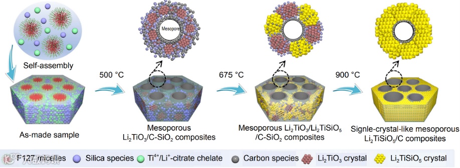 研究团队首先制备了化学计量比的Ti4+/Li+-柠檬酸配合物,利用胶束定向组装合成了介观结构复合物,通过分步结晶策略,实现了类单晶介孔Li2TiSiO5可控制备。该材料中存在着由连续单晶状Li2TiSiO5骨架包围的约4 nm的均匀介孔,同时在介孔边缘存在着厚度约2 nm的导电碳层。
