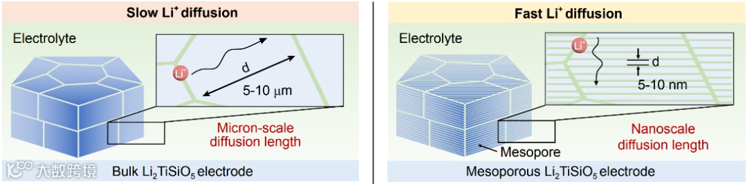 块体和介孔Li2TiSiO5电极中Li+扩散机理示意图