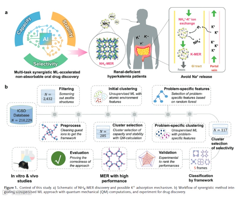 图 1本研究的背景。a)发现潜在药物和人体内钾离子吸附机制示意图。b)将机器学习方法与量子力学计算和湿实验相结合的协同方法的工作流程。