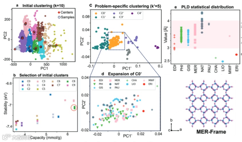 图 2 少数据驱动的机器学习部分过程。a)-b)第一次聚类结果以及根据容量、稳定性进行的类筛选。c)-e)第二次聚类的结果以及根据选择性进行的类筛选。最终筛选得到的候选无机晶体的框架MER。