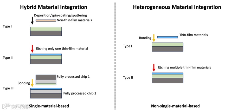 混合集成和异质集成被视为实现多材料集成的两个主要选项。如上图3所示,混合集成技术主要依靠单一材料体系的微纳加工技术,强调利用现有成熟技术以最小的迁移成本来实现多材料集成。异质集成则需要是面向多材料体系结合的复杂加工技术,相较而言具有更高的技术门槛和成本。文章认为混合集成技术是近未来更加现实的技术,可以最大程度地利用现有的技术积累成果。