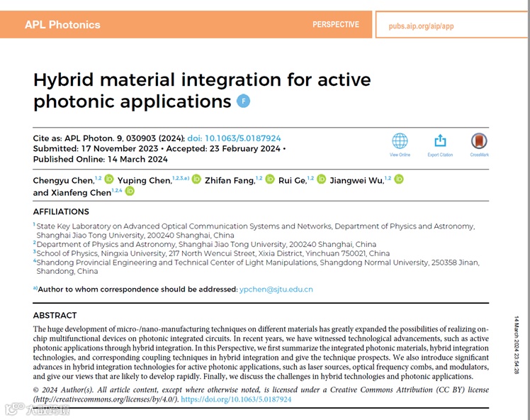 2024年3月14日,上海交通大学物理与天文学院陈险峰教授和陈玉萍教授团队在国际学术期刊APL Photonics上发表前沿观点综述论文“Hybrid material integration for active photonic applications” 。该前沿观点综述论文系统性地对集成光子学中的材料、集成技术以及耦合技术进行了总结,介绍了通过混合集成实现有源光子器件的最新进展,包括混合集成激光、混合集成光频梳、混合集成调制器等。文章展示了混合集成技术可以实现“1+1 > 2”的优势和潜力,以及未来发展所面临的挑战等。上海交通大学博士研究生陈承渝和陈玉萍教授为论文的共同第一作者,陈玉萍教授担任通讯作者,陈险峰教授担任总指导,上海交通大学为论文第一完成单位。该文章还被APL Photonics选为Featured Articles之一,展示在APL Photonics的首页。