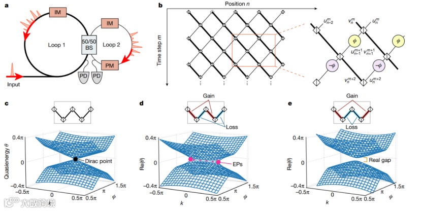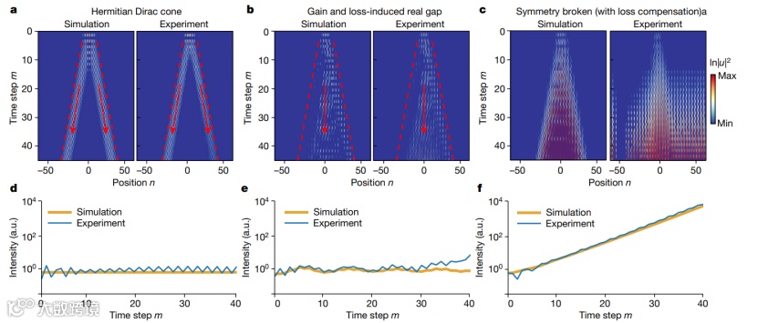 图2 在合成晶格中,高斯波包轨迹和能量的演化。(a), 厄米调控下观测到的锥形衍射。(b), 非厄米调控下对应的带质量的狄拉克准粒子(massive Dirac quasiparticle)。(c), 非厄米调控下增益和损失过大的情况。
