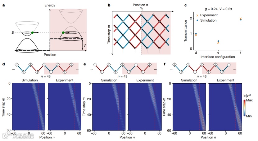图3 大质量狄拉克准粒子的克莱因隧穿(Klein tunneling)现象。(a), 克莱因隧穿示意图。(b), 合成晶格中强度和相位调制示意图。(c), 空间边界两侧不同晶胞对应的能量变化。(d-f), 空间边界两侧不同晶胞产生的不同隧穿现象。