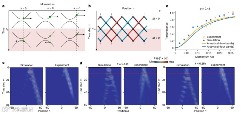 图4 狄拉克准粒子的时间反射和折射。(a), 时间边界示意图。(b), 合成晶格中强度和相位调制示意图。(c-d), 在不同情况下狄拉克例子的轨迹。(e), 理论与实验的透射率比较。