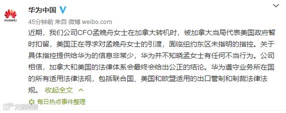 近期,我们公司CFO孟晚舟女士在加拿大转机时,被加拿大当局代表美国政府暂时扣留,美国正在寻求对孟晚舟女士的引渡,面临纽约东区未指明的指控。