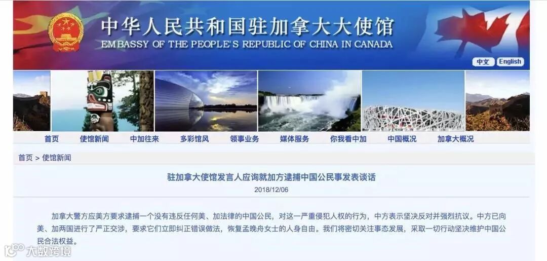 北京时间12月6日,中国驻加拿大使馆发言人应询就加方逮捕中国公民事发表谈话。发言人在谈话中称,加拿大警方应美方要求逮捕一个没有违反任何美、加法律的中国公民,对这一严重侵犯人权的行为,中方表示坚决反对并强烈抗议。中方已向美、加两国进行了严正交涉,要求它们立即纠正错误做法,恢复孟晚舟女士的人身自由。我们将密切关注事态发展,采取一切行动坚决维护中国公民合法权益。