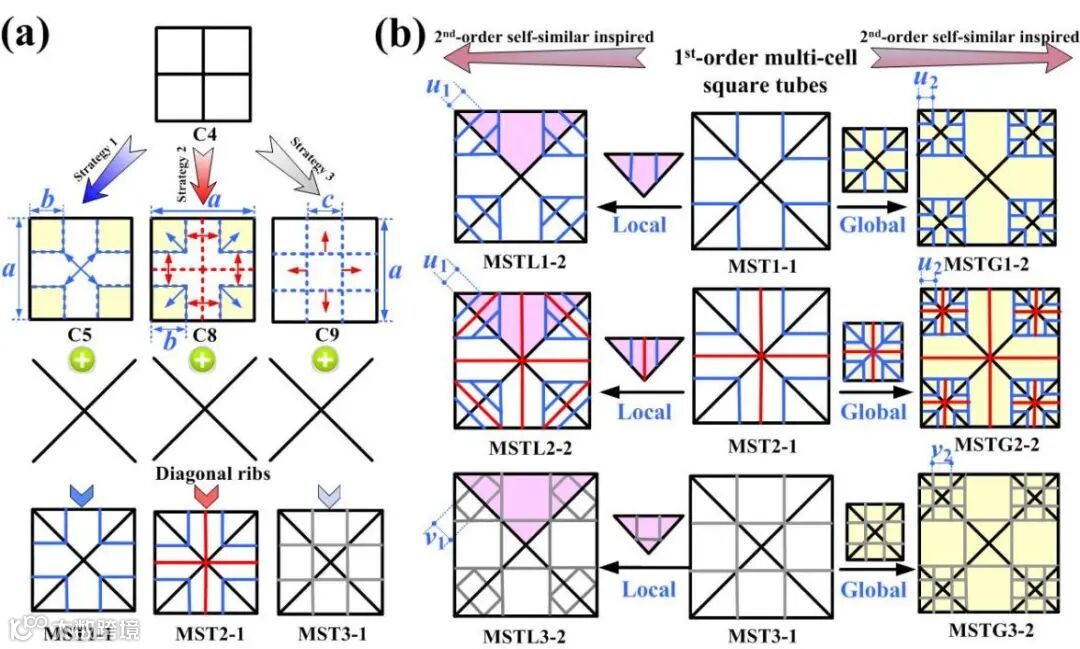 图1 多胞方管设计策略:(a) 一阶多胞方管 (MST), (b) 二阶全局自相似多胞方管 (MSTL) 和二阶局域自相似多胞方管 (MSTG)