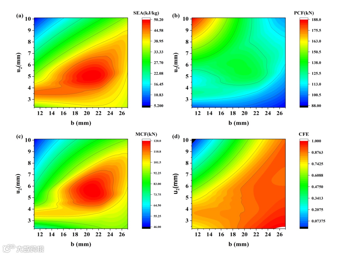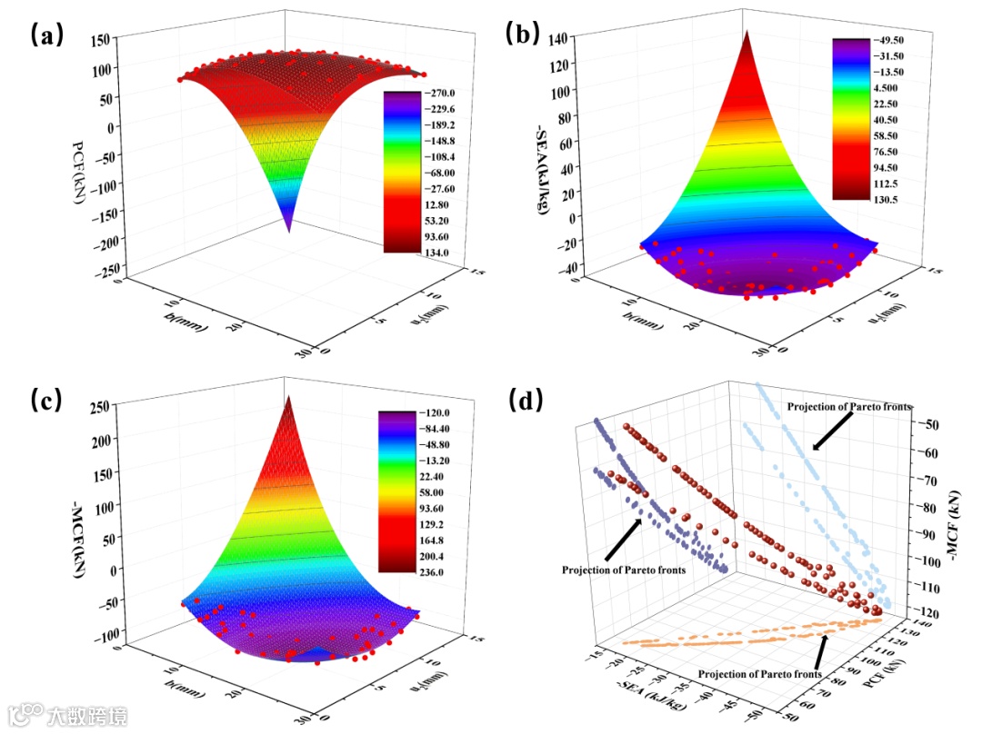 图5 响应多项式模型:(a) PCF, (b) -SEA, (c) -MCF, and (d) MSTG1-2多胞管的帕累托前沿解集。