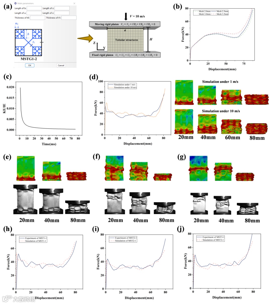 图2 有限元模拟与验证分析: (a) 有限元模型示意图, (b) 网格收敛性分析, (c) 压缩过程中总动能与总内能之比,(d) 在1m/s和10m/s压缩速度下的力-位移曲线和变形形态, (e)-(g) 准静态压缩下试件的变形形态, (h)-(j) 有限元模拟和实验测试下的力-位移曲线
