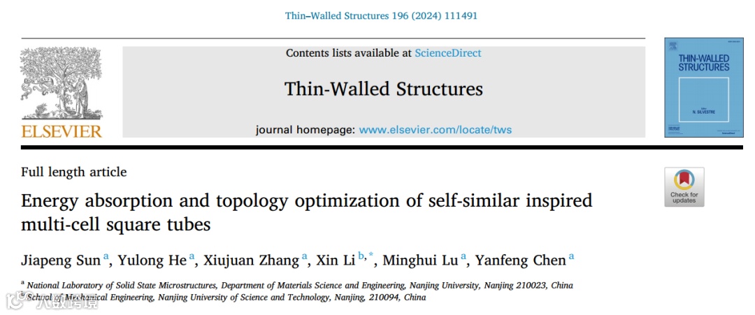 近日,南京大学现代工程与应用科学学院陈延峰教授、卢明辉教授团队与南京理工大学机械工程学院李鑫教授合作,提出了两种顶角增强原理与自相似原理相结合的多胞方管截面拓扑设计策略。该项工作通过实验测试、有限元模拟分析、理论推导与拓扑优化相结合的方法,验证了两种截面拓扑设计策略对于多胞管耐撞性优化的有效性,相关研究对于截面拓扑优化方法在多胞管耐撞性设计的深入应用具有重要的参考意义。该项研究成果以“Energy absorption and topology optimization of self-similar inspired multi-cell square tubes”为题,发表于期刊《Thin-walled Structures》上。南京大学现代工程与应用科学学院22级硕士研究生孙嘉鹏为论文第一作者,南京理工大学李鑫教授为通讯作者,南京大学陈延峰教授、卢明辉教授、张秀娟副教授给予了重要建议,南京大学何玉龙博士后对本文也有重要贡献。